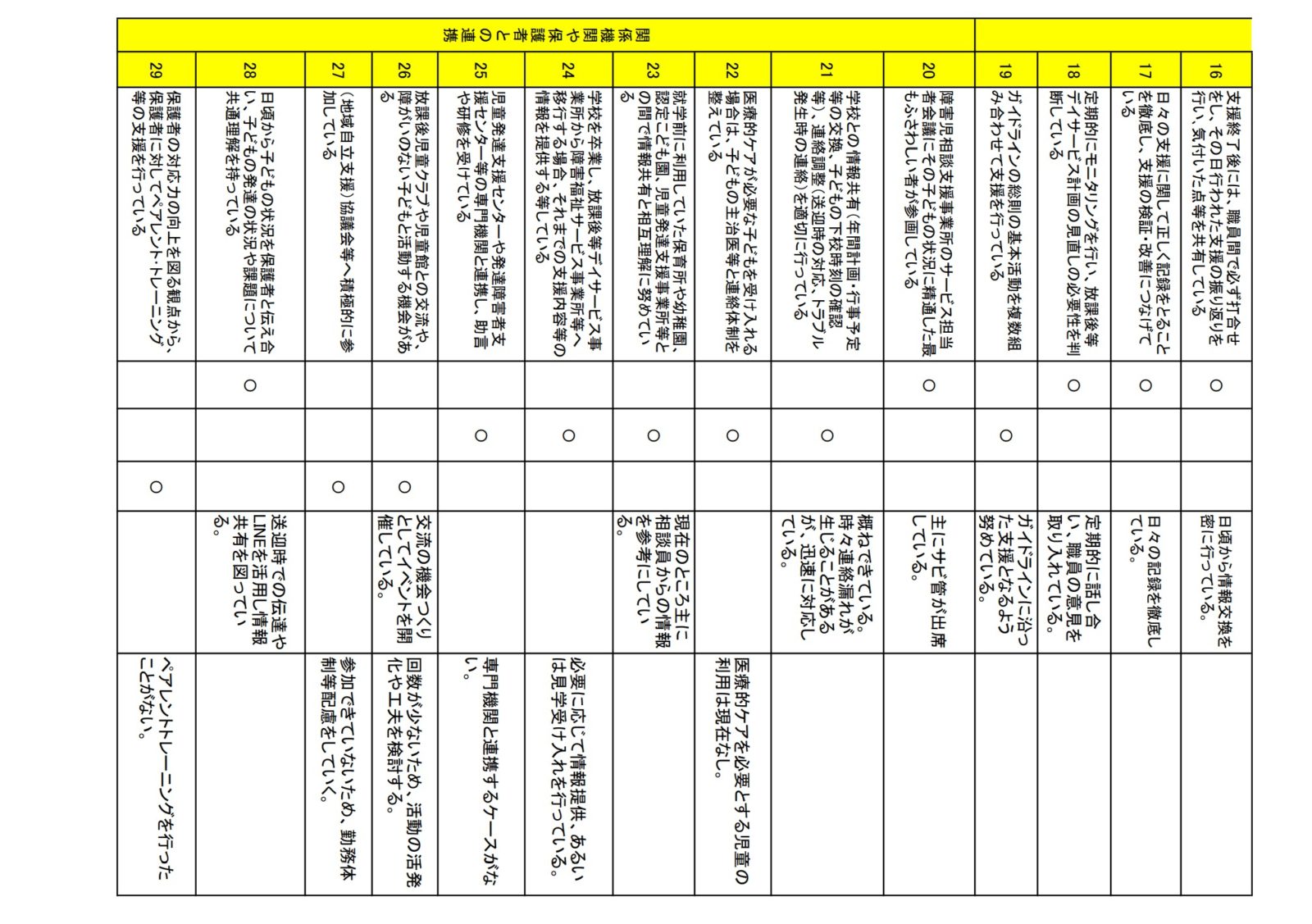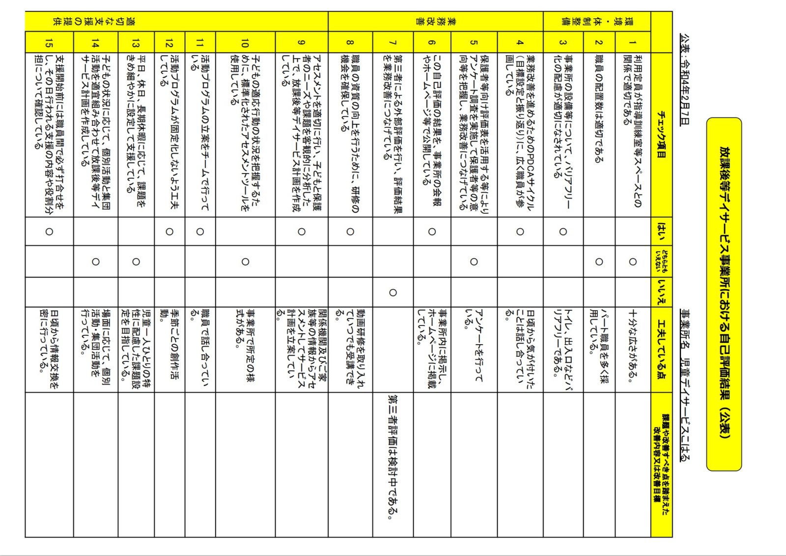 児童デイサービスこはる自己評価、アンケート結果の公表について 2022年2月7日 事業所自己評価結果①ダウンロード 事業所自己評価結果②ダウンロード 事業所自己評価結果③ダウンロード ご利用者・ご家族様の回答集計結果ダウンロード アンケートにご協力いただきまして誠にありがとうございます。ご意見を参考によりよいサービスの提供につとめてまいります。